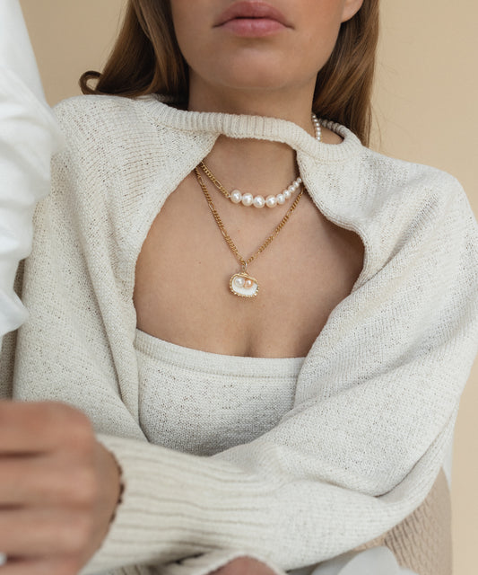 • Gold-plated brass twisted rope necklace with the WALD Berlin Drop It Like It’s Hot Shell Necklace pendant laid on a marble surface partially covered by a white cloth. A person wears a cream sweater and top, accessorized with two necklaces: one delicate pearl strand and the WALD Berlin "Drop It Like It’s Hot Shell Necklace," featuring an exquisite gold-plated brass pendant. A hand delicately holds the Drop It Like It’s Hot Shell Necklace by WALD Berlin, crafted from gold-plated brass and adorned with lustrous pearls, over a marble surface. A person with red nail polish and gold bracelets holds a bowl filled with red cherries, assorted pearl jewelry, and the Drop It Like It’s Hot Shell Necklace by WALD Berlin, crafted from gold-plated brass. Close-up of a woman wearing a white top and a WALD Berlin Drop It Like It’s Hot Shell Necklace with a large, eye-shaped pendant. Wearing a metallic silver long-sleeve dress and layered WALD Berlin's handmade gold jewelry with pearl accents, including the Drop It Like It’s Hot Shell Necklace, arms crossed, against a leopard print background. A person in a white knit shrug and tube top, adorned with WALD Berlin's Drop It Like It’s Hot Shell Necklace, stands near sculptures. A hand displays the WALD Berlin "Drop It Like It's Hot" Shell Necklace in front of a small white bust sculpture of a woman, highlighting exquisite jewelry craftsmanship.