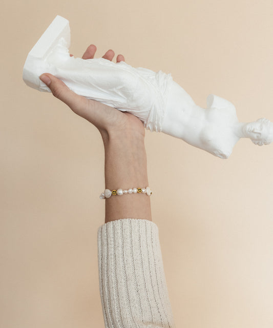 • The WALD Berlin Smilie Dude Pearl Bracelet with Extention is showcased on a marble surface, featuring sweetwater pearls and cheerful smiley beads. WALD Berlin Smilie Dude Pearl Bracelet with Extention, Berlin. A woman's hand wearing a WALD Berlin Smilie Dude Pearl Bracelet with Extention beside a statue in Berlin, Germany. A woman elegantly displays her matching necklace, bracelet, and rings adorned with sweetwater pearls. She wears a light-colored sweater while showcasing the WALD Berlin Smilie Dude Pearl Bracelet with Extension, her hands gently crossed in front to complement the stunning jewelry. A hand with pleated, white sleeves holds a daisy, a cosmos flower, and WALD Berlin's Smilie Dude Pearl Bracelet on a marble surface. A person in a sleeveless dress holds a yellow flower, wearing WALD Berlin's Smilie Dude Pearl Bracelet with an extension on their wrist. This delightful jewelry features handmade touches, including exquisite sweetwater pearls. Three gold bracelets rest on a beige surface: an 18k gold-plated brass chain design, the WALD Berlin Smilie Dude Pearl Bracelet adorned with sweetwater pearls and smiley faces, and another featuring rectangular links. The WALD Berlin "Smilie Dude Pearl Bracelet with Extension" features yellow smiley face beads, sweetwater pearls, and a gold chain and clasp set against a pristine white background.
