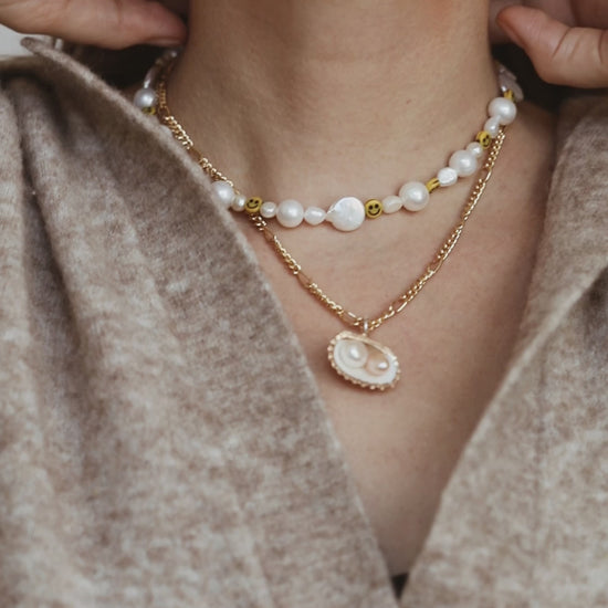 Material sweetwater pearls, acetate smiley beads, 18k gold-plated brass extention chain